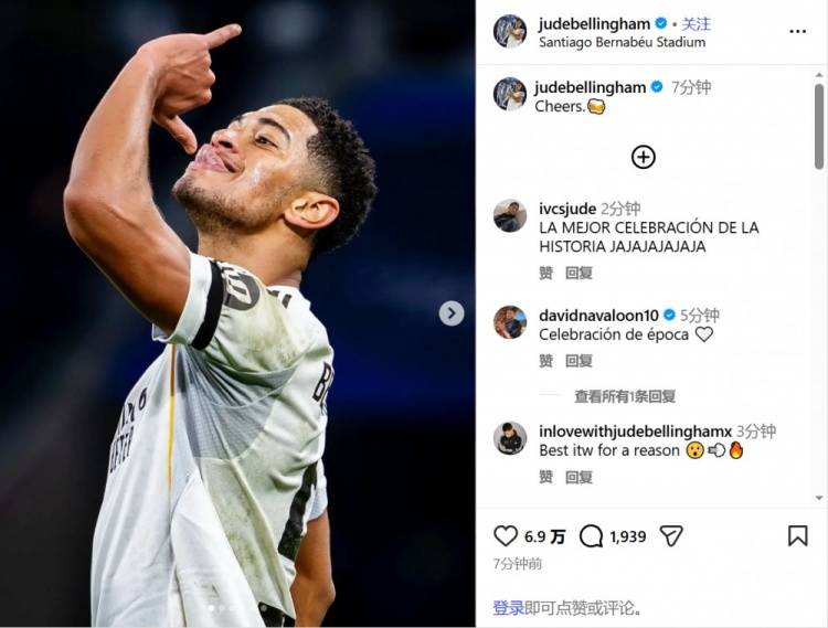 08直播1月21日讯 欧冠联赛阶段第7轮,皇马6-1大胜摩纳哥。赛后,皇马中场贝林厄姆在社交媒体晒图,庆祝球队获胜。 贝林厄姆在社交媒体上晒出了自己进球后的“喝酒”庆祝动作,并配文写道:“干杯
